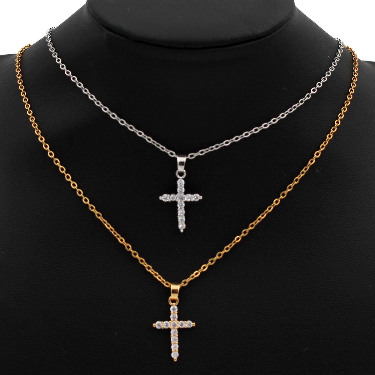 Ατσάλινο κολιέ "σταυρός με λευκές πέτρες" μήκος 40εκ.+προέκταση 70396