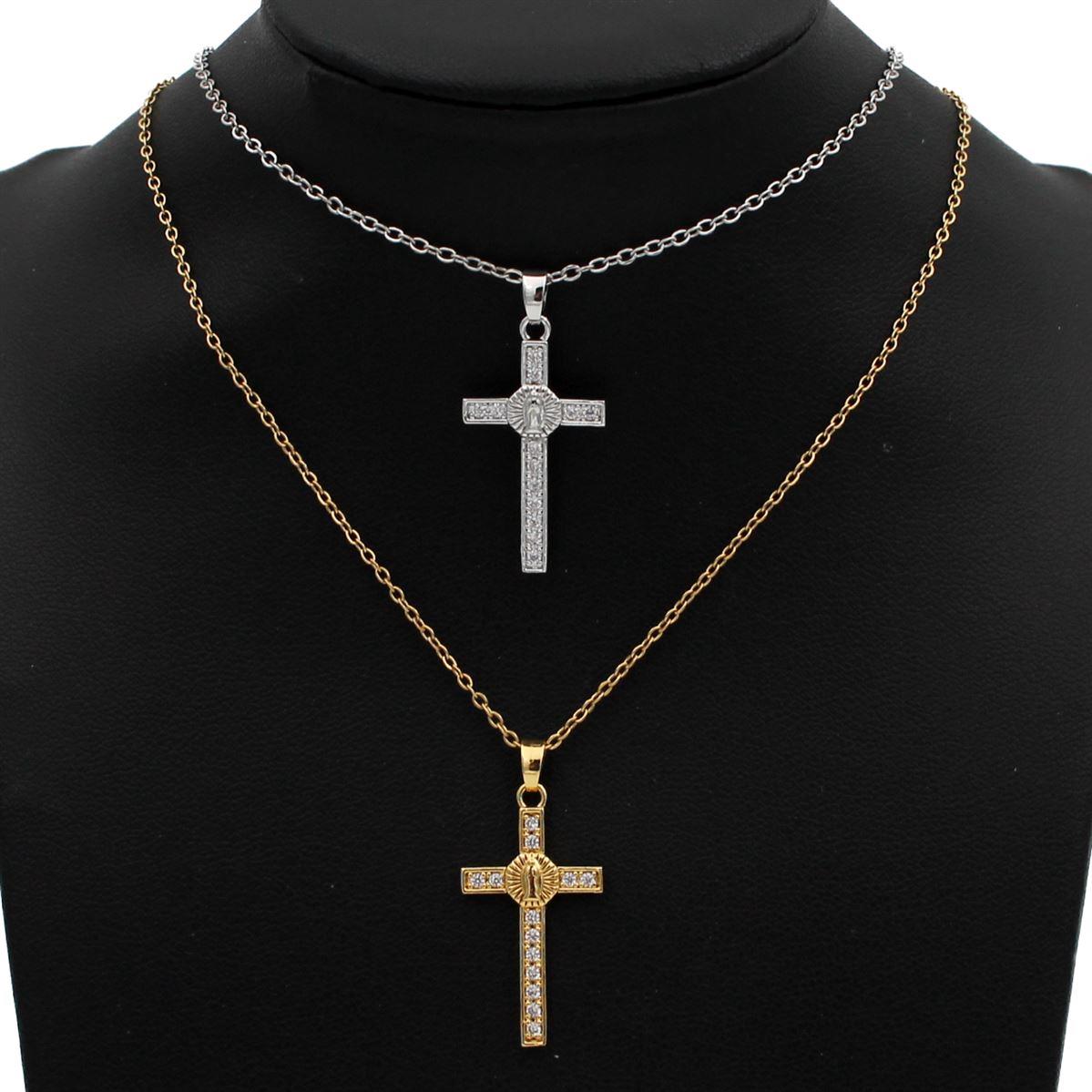 Ατσάλινο κολιέ "σταυρός με λευκές πέτρες και παναγία" μήκος 40εκ.+προέκταση 70399