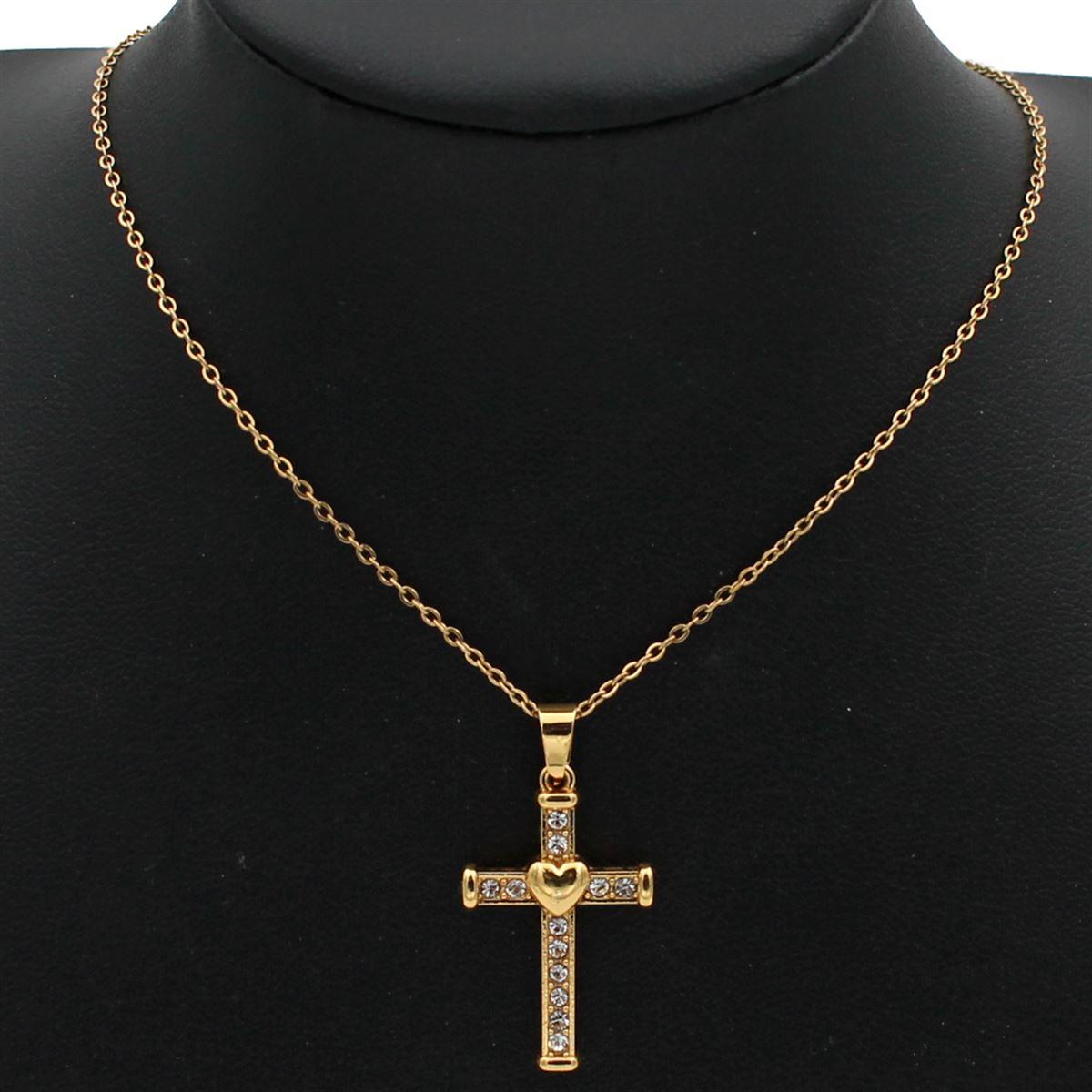 Ατσάλινο κολιέ "σταυρός με καρδιά και λευκές πέτρες" μήκος 40εκ.+προέκταση 70688