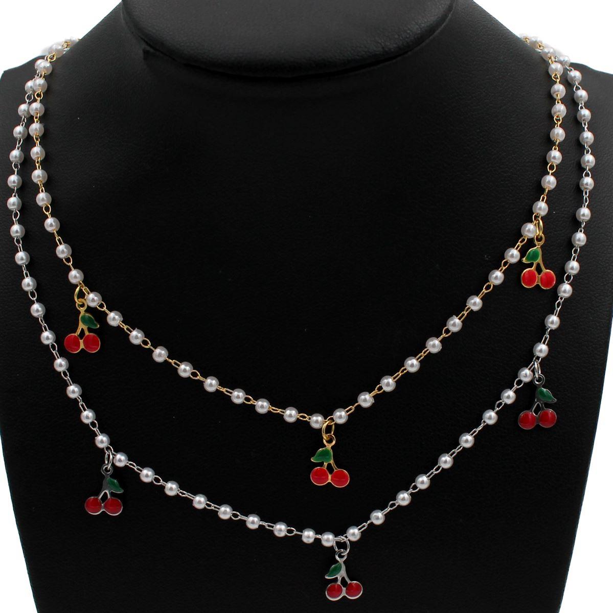 Ατσάλινο κολιέ "με πέρλα και charms κεράσι" μήκος 40εκ.+προέκταση 70821